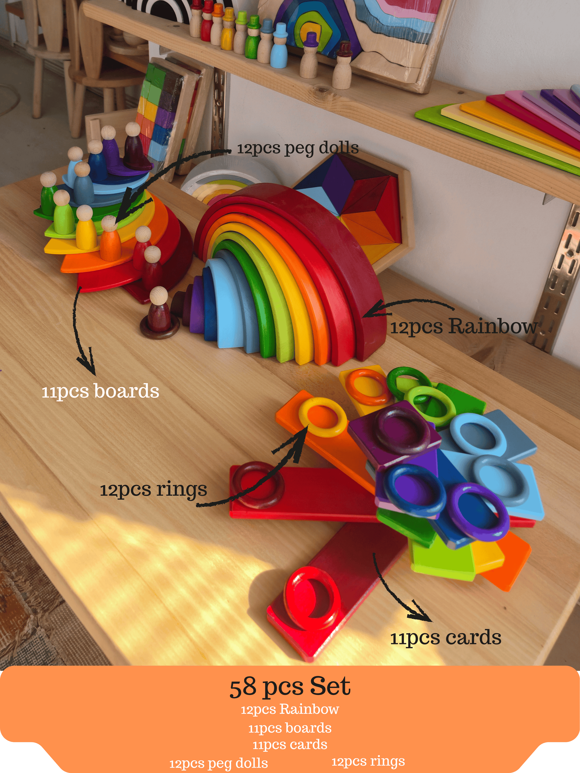 KirtKirt Ahsap 58'li Waldorf Gokkusagi Seti, Montessori oyuncaklari ve egitici ahsap oyuncaklar arayan ebeveynler icin mukemmel bir tercihtir. Dogal, kaliteli ve guvenli malzemelerle uretilen bu set, cocuklar icin eglenceli, ogretici ve surdurulebilir bir oyun deneyimi sunar.