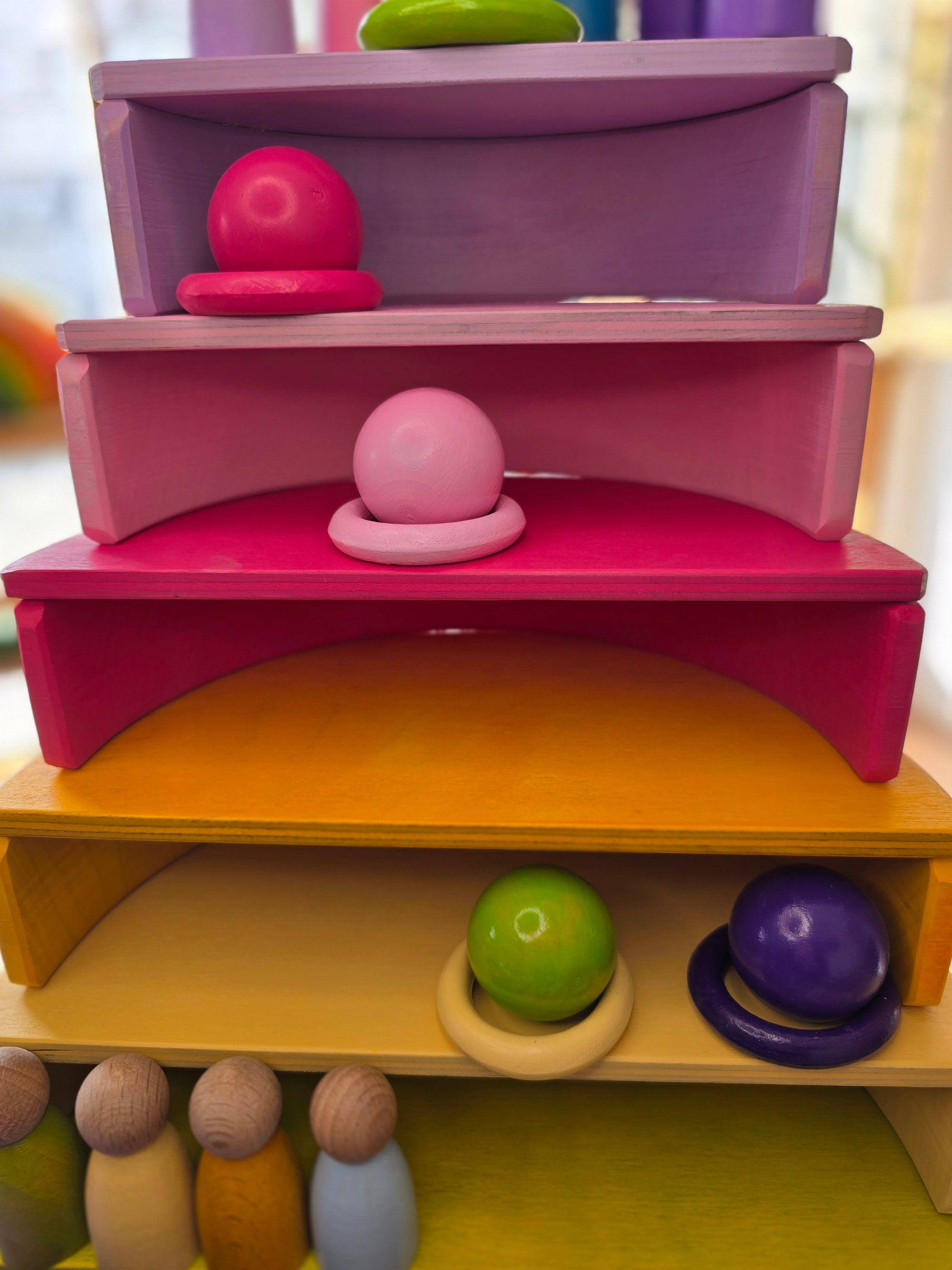 Waldorf Gokkusagi: Ahsap bloklardan yapilan 12 renkli gokkusagi parcasi, cocuklarin renkleri ogrenmelerine ve hayal guclerini kullanmalarina olanak tanir.